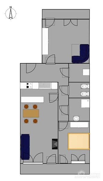 Disposizione interna dell'immobile: Soggiorno con sala da pranzo e cucina - esposizione sud; Camera da letto 1 - esposizione sud; Camera da letto 2 - esposizione nord; Dispensa; Bagno; WC separato; Terrazza a sud accessibile dal soggiorno e dalla camera da letto 1; Terrazza a nord accessibile dalla camera da letto 2.